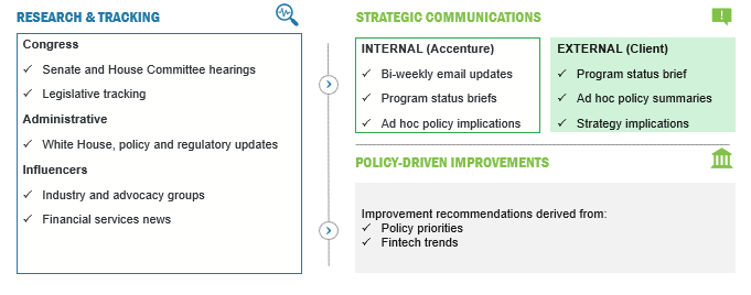 Our client sits within financial services, and as a result, they must keep pace with breaking news about policy and regulatory updates. New regulations not only influence the outcomes of our digital strategy but can also lead to innovative . The client requested a communications strategy to ensure both our client and Accenture resources were informed on key policy developments.