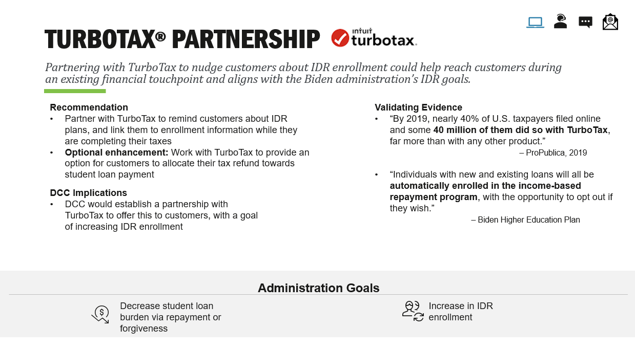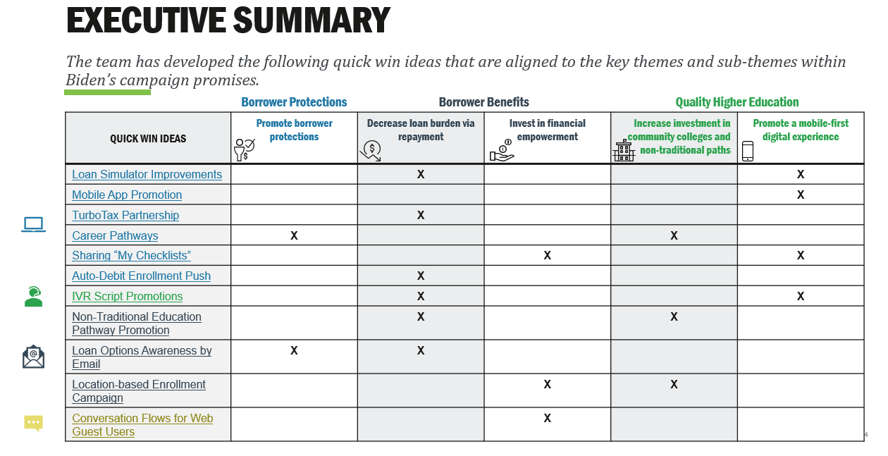 The image provided below displays an overview of the policy strategy I developed not only to better inform our clients of breaking news and legislative updates but also to promote informed and policy-driven recommendations that directly impact our digital transformation efforts. When I initially formed this strategy, I quickly gathered all credible inputs, including all congressional announcements and White House memoranda, that would inform our project’s internal and client communications. By considering policy trends, we were able to create a digital transformation strategy to both meet the demands of a highly regulated industry and our client’s goal of providing a world-class customer experience through their digital toolkit.